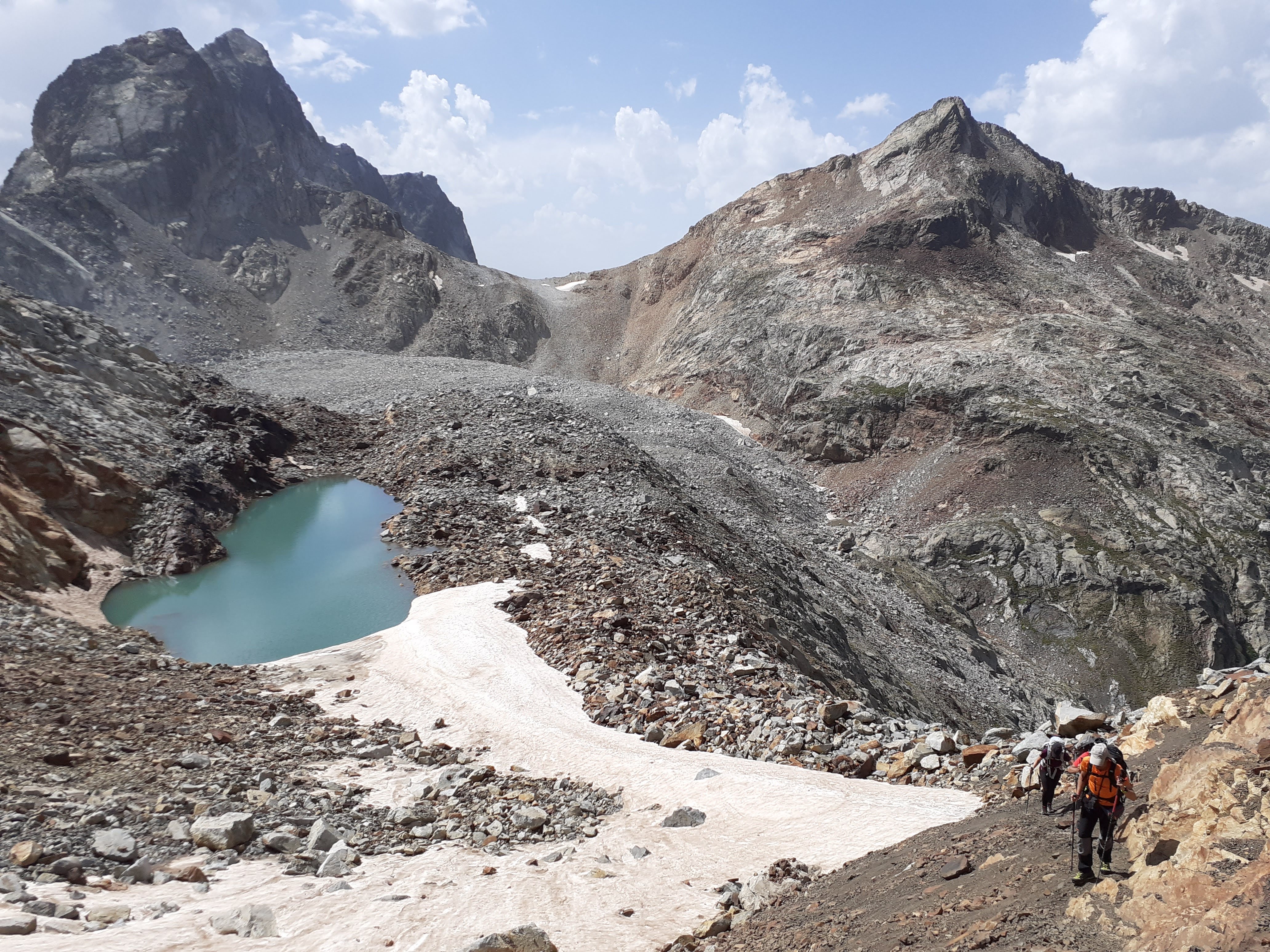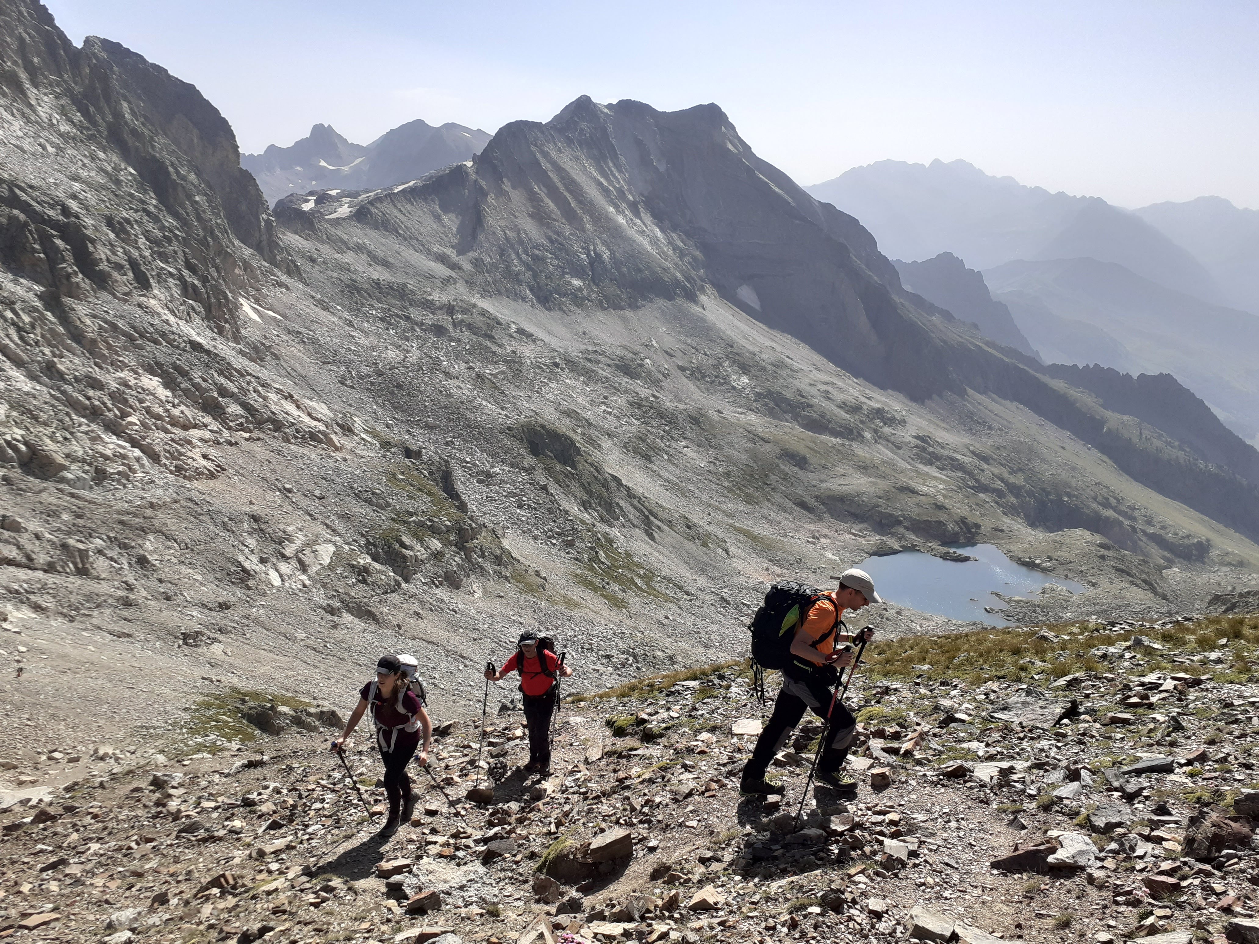El descenso, por una senda colgada bordeando el Lac Glacé y en la cabecera del circo de Espingo es magnífico Regresaremos al refugio del Portillón.