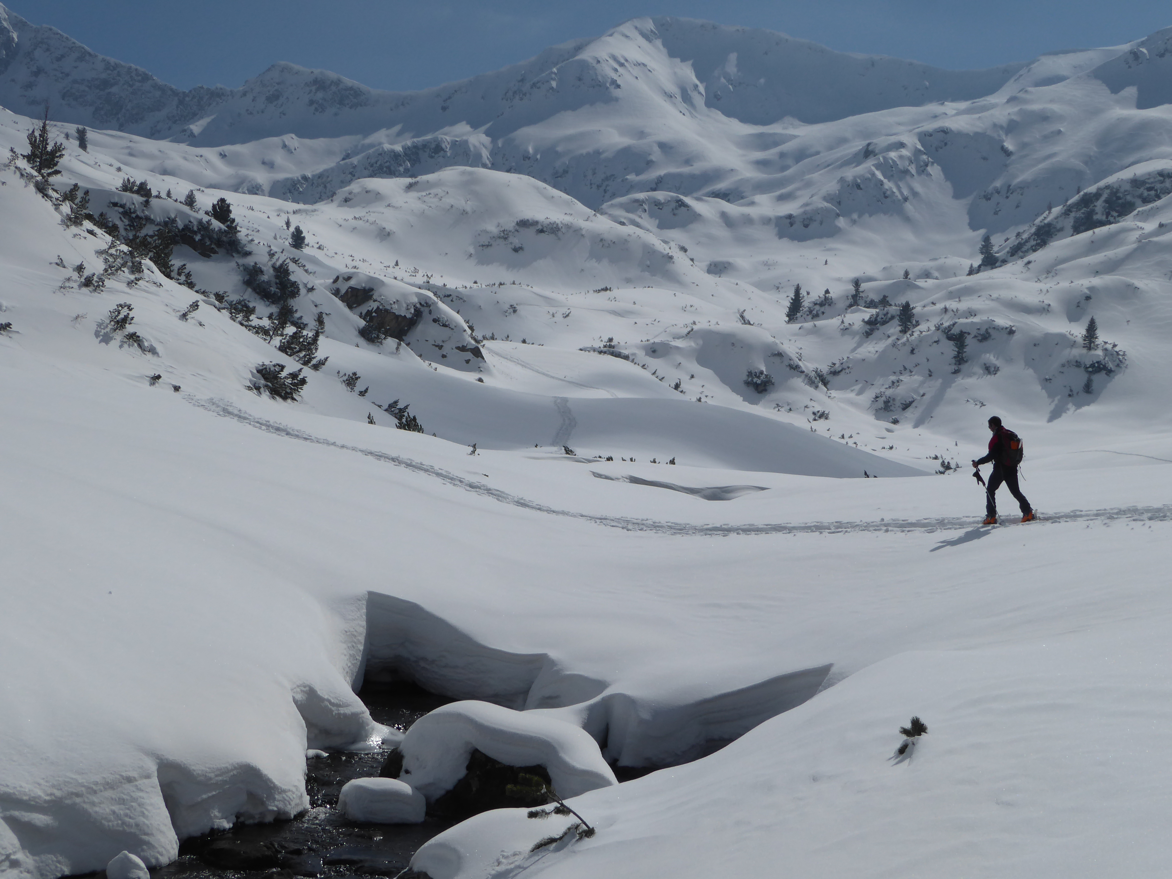 Para empezar, ascenderemos bastantes metros en telesilla para ganar metros sobre un bosque tupido que con nieve haría duro el llegar a terreno abierto. Realizaremos un itinerario circular variado con varias subidas y bajadas durante el recorrido transitando por los numerosos ibones de montaña que aquí se encuentran.