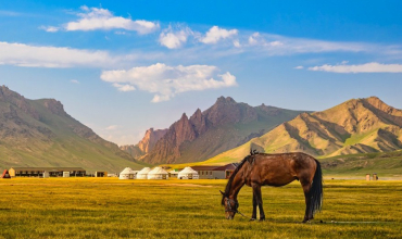 La ruta de hoy asciende 700 metros de altitud, hasta el collado sobre el lago, por un sendero serpenteante y fácil de recorrer. En el collado se hará una parada para el picnic frente a las vistas del enorme valle con el lago Son Kul en el centro. Tras la parada, descenso en dirección al lago hasta alcanzar el campamento de yurtas de hoy.