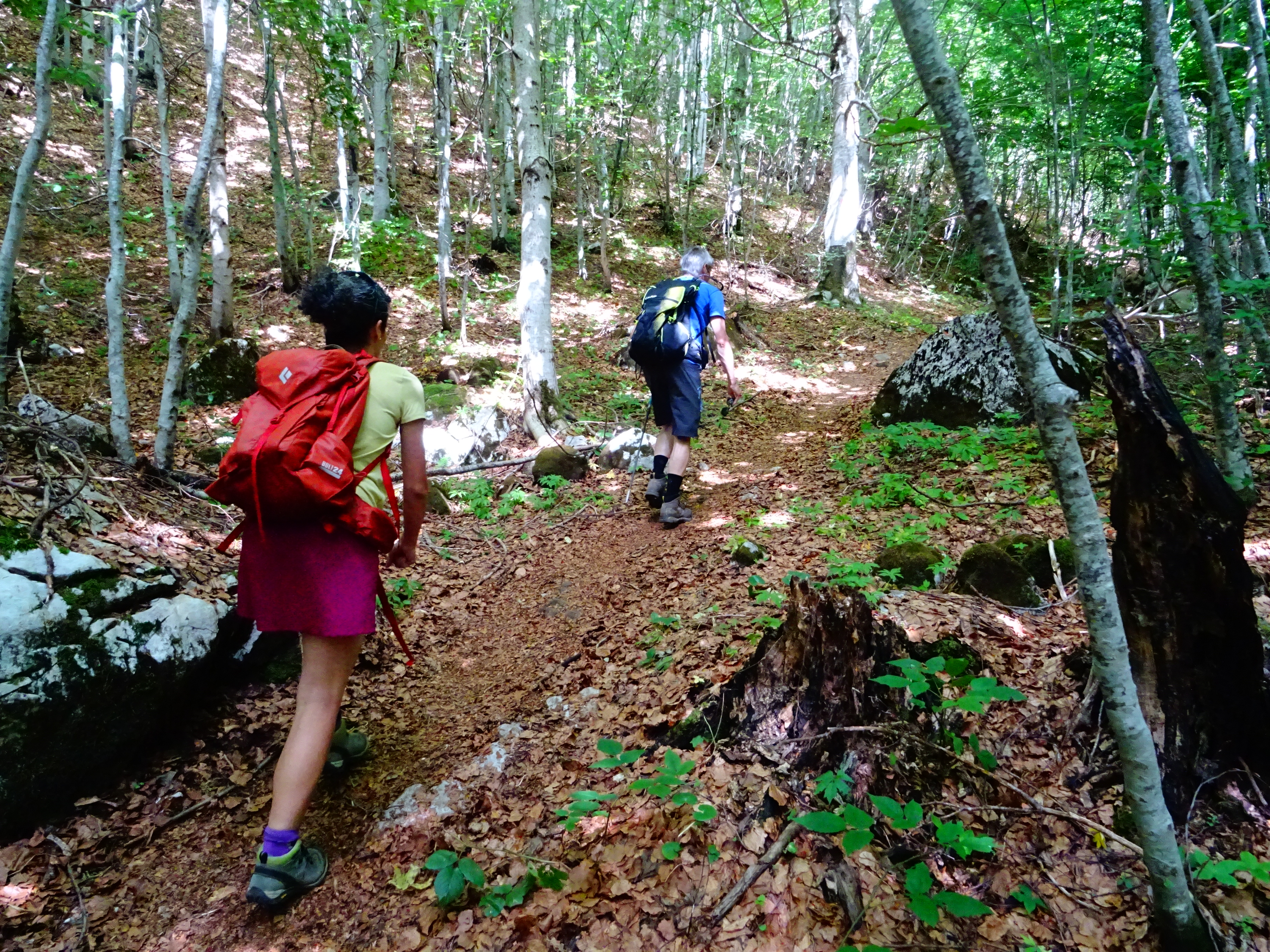 La jornada culmina en la cima Taljanka / Maja Vajushës (2.057 m), punto panorámico excepcional con vistas a tres países. El descenso atraviesa un bosque de hayas centenarias —especie dominante en las laderas medias de los Dináricos, protegida en varios parques nacionales— que regala sombra y una luz filtrada difícilmente olvidable.