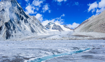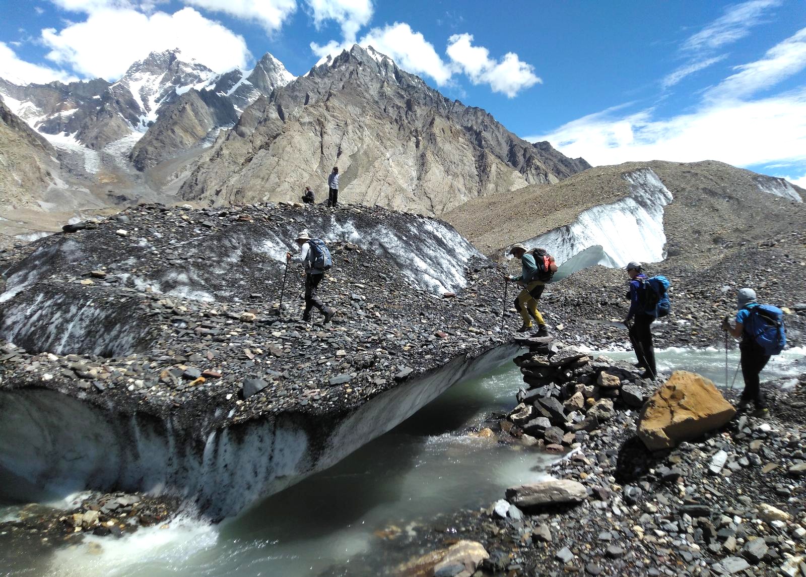 Continuamos remontando el río para al cabo de poco tiempo, llegar al frente glaciar. Ascenderemos unos metros para encaramarnos a la parte superior e iremos con sube-baja, buscando el mejor itinerario posible. Nos saldremos de éste para el último tramo, realizarlo por terreno más inestable de piedra y llegar a nuestro siguiente campamento, Urdukas.
