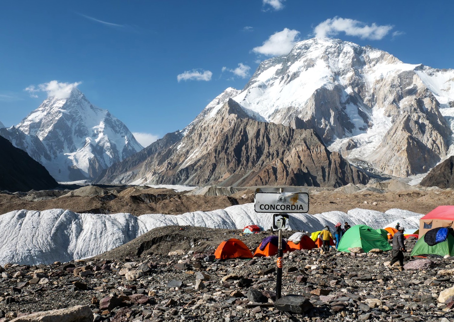 Este sitio merece un apartado extra entre todos los lugares de la Tierra. Concordia es la confluencia de glaciares (Baltoro y Godwin Austen) que vienen del Sur de los Gasherbrum y el Chogolisa y del Norte del increíble K2, el panorama de este punto es único. El glaciar del Baltoro aquí presenta una anchura de más de 2 km.