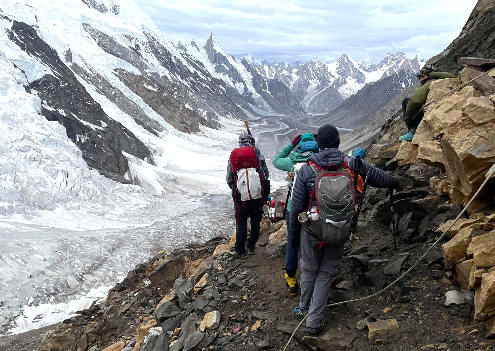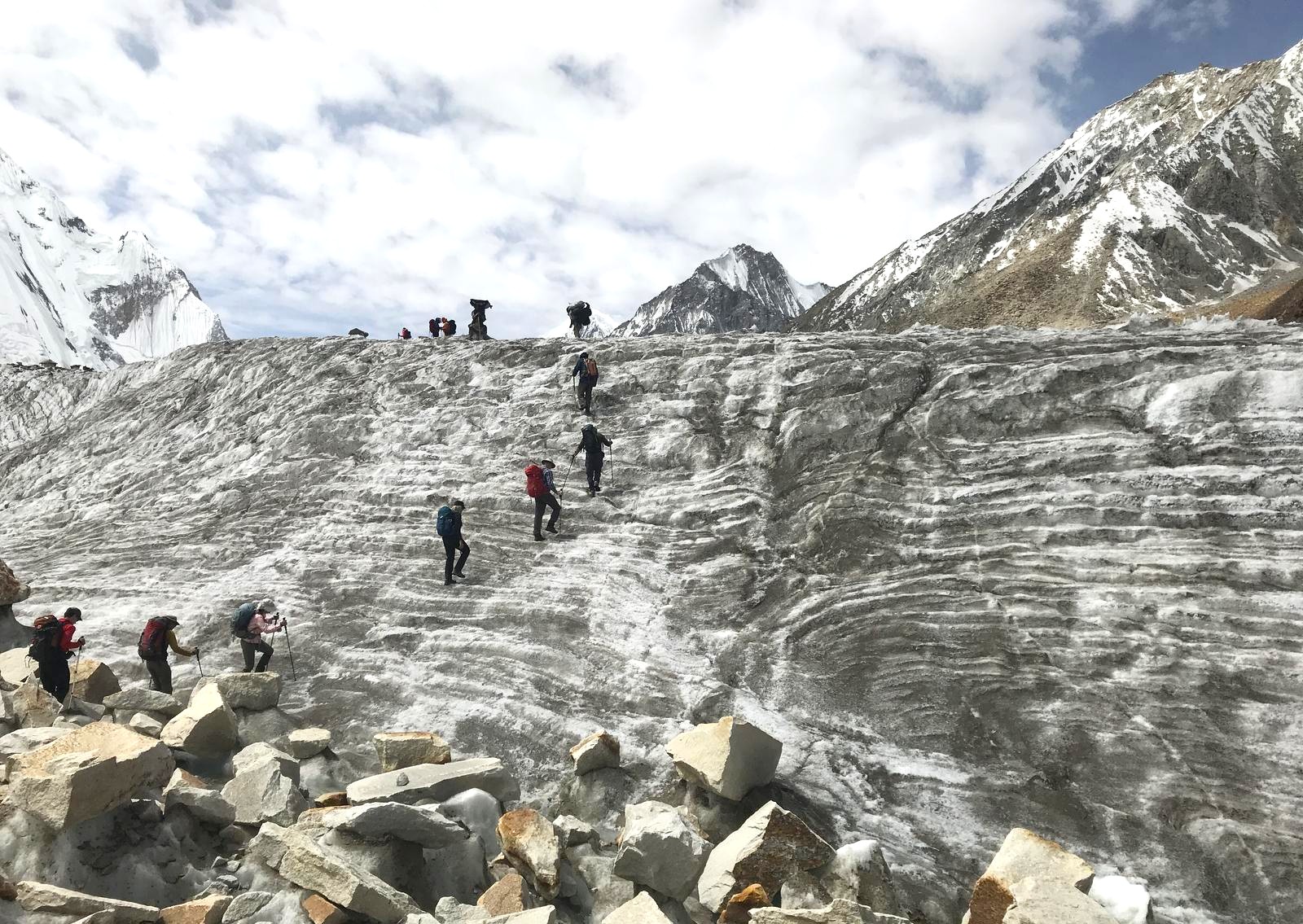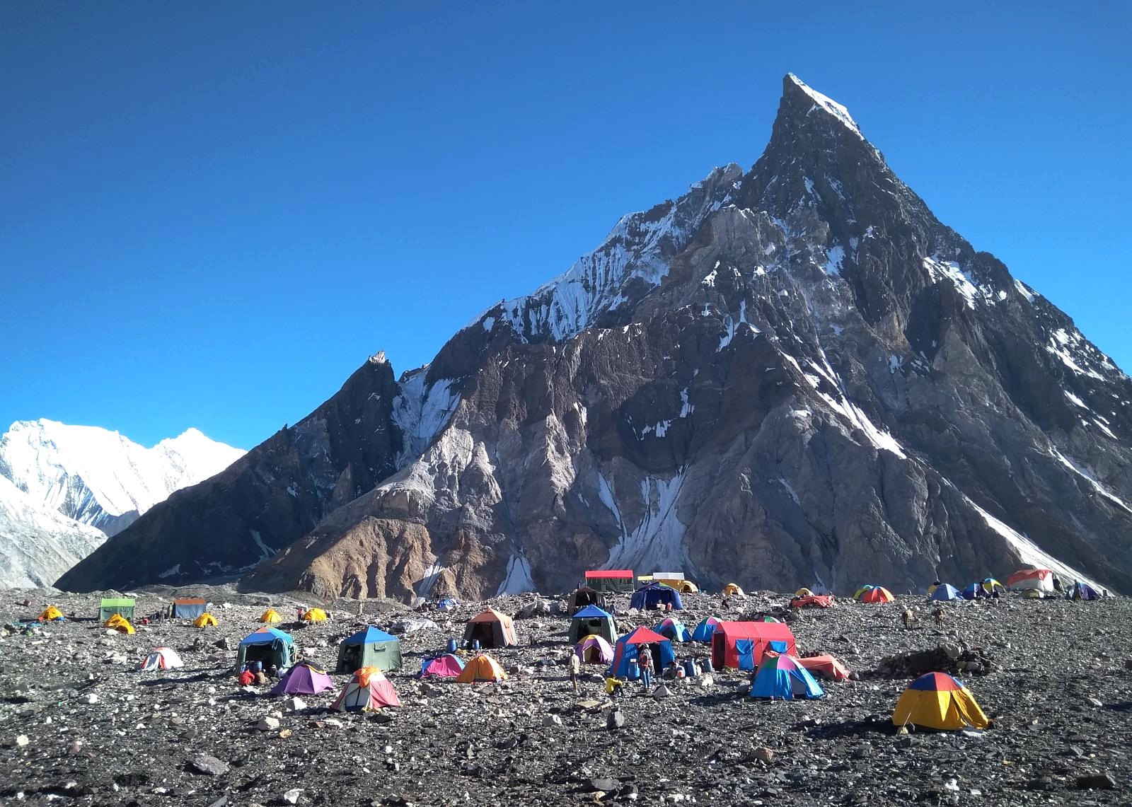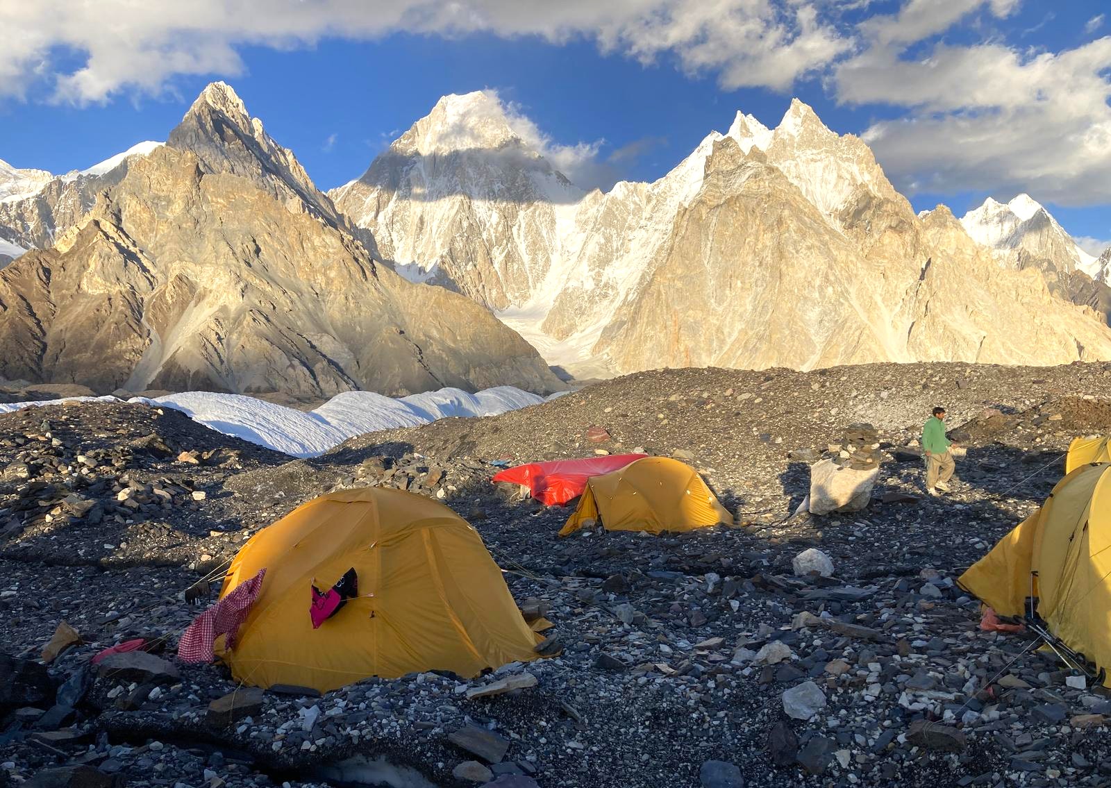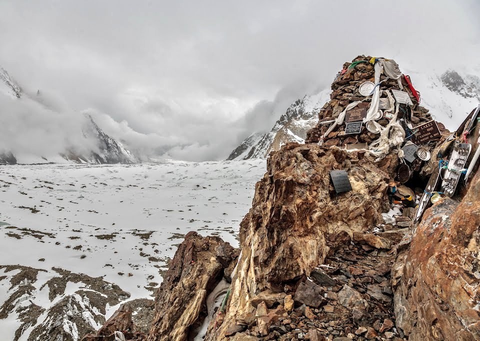Cada vez el terreno se vuelve más inhóspito, a nuestro alrededor roca y hielo. Las grandes montañas hacen acto de presencia, como el Broad Peak, el primer ochomil. O la gigantesta y peligrosa pared del G-IV. Gasherbrum significa la "pared brillante" por su muy visible cara oeste, pero el nombre realmente proviene de "rgasha" (bonita) + "brum" (montaña) en idioma Balti, es decir "montaña bonita”.