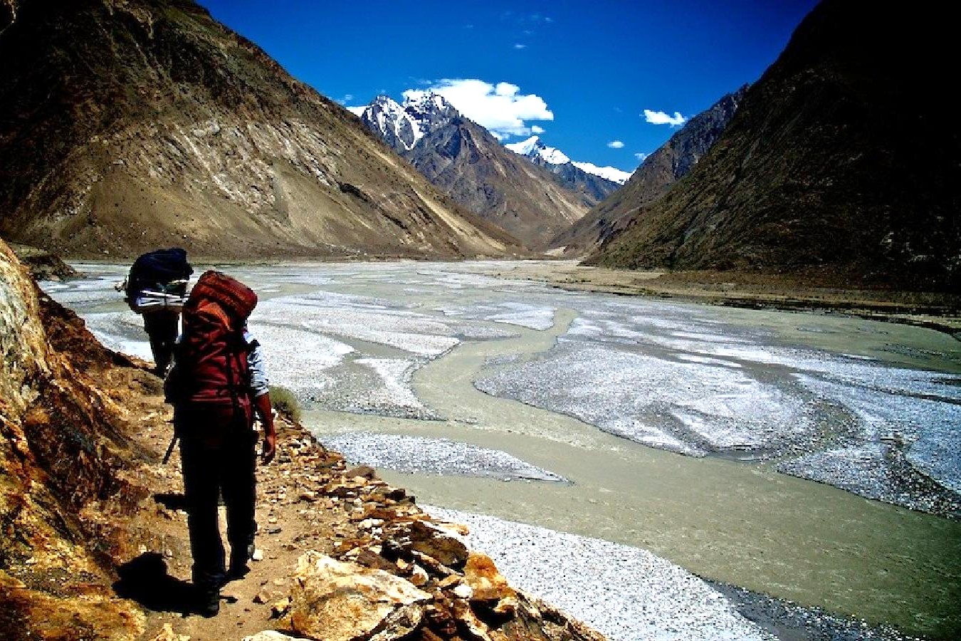 Dejamos la carretera asfaltada para introducirnos ya en una pista, bajo montañas que ya alcanzan algunas de ellas los 7.000 metros. Remontamos el valle del río Shigar, afluente del Indo para más tarde, tomar otro valle que baja del Baltoro, con el río Braldu.