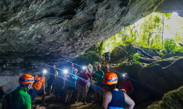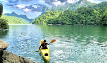 El lago está rodeado por majestuosas formaciones kársticas que pertenecen a la cordillera de Pia Booc, así como por frondosos bosques perennifolios que acentúan la belleza del entorno. Al llegar al embarcadero de Boc Lom, recibiremos una breve instrucción sobre el manejo de kayak y nos equiparemos con todo el material necesario: bolsas estancas, equipo deportivo y chalecos salvavidas. Navegaremos por el río Nang en kayak y en barco, adentrándonos en la imponente cueva Puong, famosa por su tamaño y sus formaciones rocosas. Posteriormente, cruzaremos el río Nang y recorreremos una zona escarpada salpicada de curiosos acantilados conocidos como “orejas de gato”.