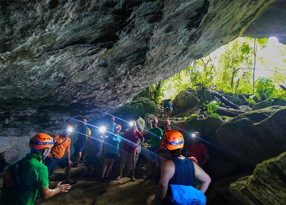 El lago está rodeado por majestuosas formaciones kársticas que pertenecen a la cordillera de Pia Booc, así como por frondosos bosques perennifolios que acentúan la belleza del entorno. Al llegar al embarcadero de Boc Lom, recibiremos una breve instrucción sobre el manejo de kayak y nos equiparemos con todo el material necesario: bolsas estancas, equipo deportivo y chalecos salvavidas. Navegaremos por el río Nang en kayak y en barco, adentrándonos en la imponente cueva Puong, famosa por su tamaño y sus formaciones rocosas. Posteriormente, cruzaremos el río Nang y recorreremos una zona escarpada salpicada de curiosos acantilados conocidos como “orejas de gato”.