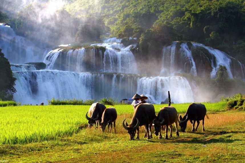 Continuando nuestro recorrido entre paisajes de gran belleza natural, llegaremos a una de las joyas escondidas de Vietnam: las espectaculares Cataratas Ban Gioc. Esta maravilla natural, que se extiende a lo largo de más de 300 metros en la frontera entre Vietnam y China, es considerada una de las cascadas más impresionantes del Sudeste Asiático, y también una de las menos visitadas por el turismo internacional. Con una caída de hasta 53 metros, las aguas descienden en varios niveles sobre un lago de color turquesa, enmarcadas por una vegetación exuberante y montañas que completan un paisaje casi irreal.